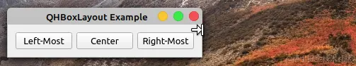 下面是一个小型应用程序,显示了如何使用QHBoxLayout创建水平布局。在此示例中,您将使用QPushButton对象根据将小部件添加到代码中的顺序更好地可视化每个小部件在布局中的放置位置: