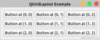 QGridLayout对象中的每个小部件都占据由您在.addWidget()中提供的一对坐标定义的单元格。每个按钮上的文字均反映了这些坐标。坐标是从零开始的,因此第一个单元格位于(0,0)。