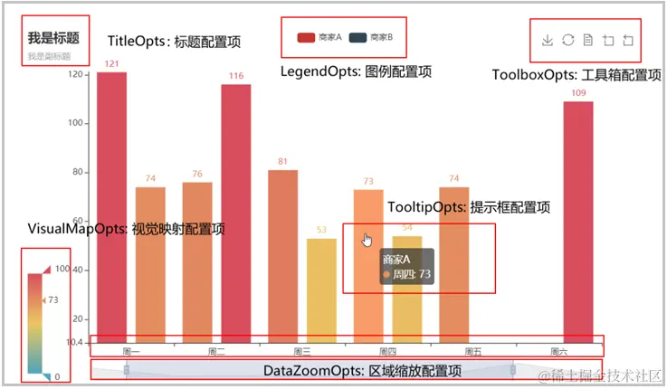 当我们学会了如何使用pyecharts绘图,并且已经绘制出来了某个图形,此时这个图形并不一定好看。这就需要我们学会使用全局配置项,进行图形参数的调节与设置。