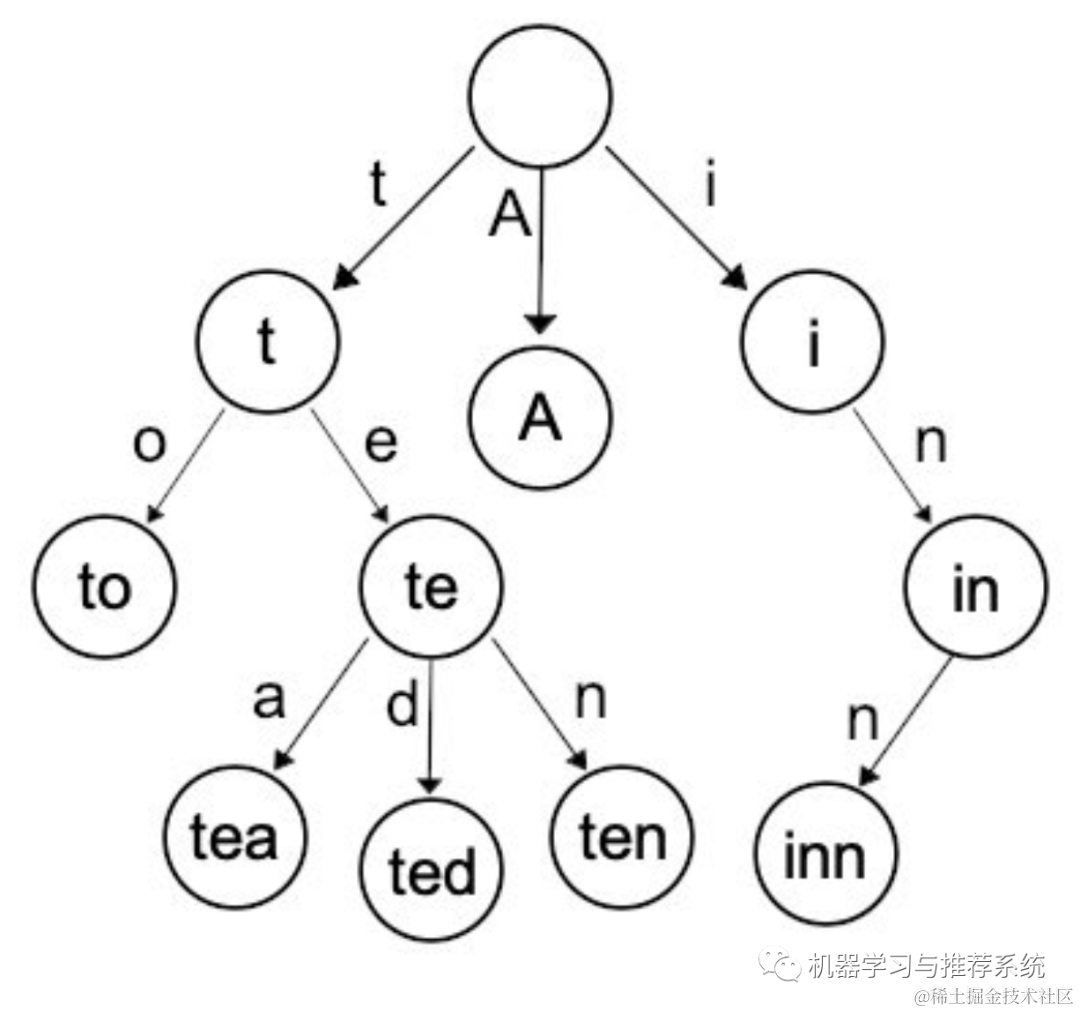 上面这个 Trie 的例子由 “A”,“to”,“tea”,“ted”,“ten”,“i”,“in” 和 “inn” 生成。一旦一个像这样的 Trie 字典树结构被生成,去判断任何一个单词是否在这个 Trie 字典树中就是 O(n) 复杂度的。如果我在搜索 “ted”,我会消耗 O(1) 去寻找 “t”,然后从 “t” 节点再消耗 O(1) 去寻找 “e”,并且再从 “te” 节点消耗 O(1) 去到 “d”。