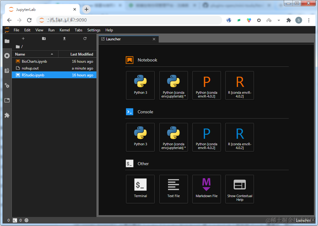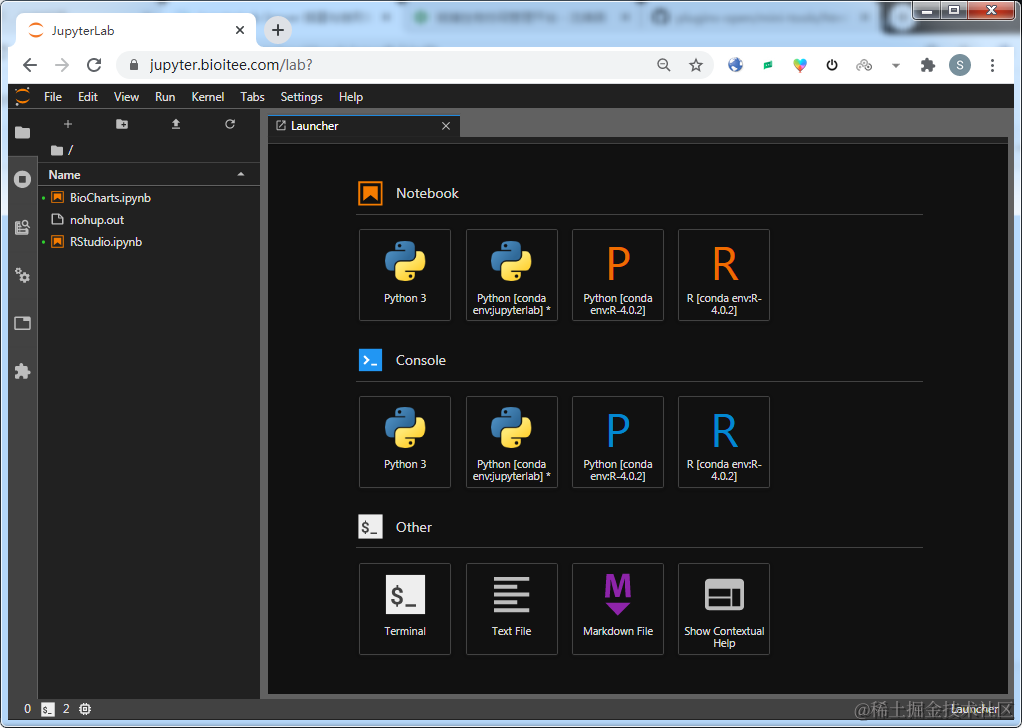 安装好所有的 Conda 环境以及对应的 Jupyter 核心之后,就可以依照一般的方式启动 JupyterLab: