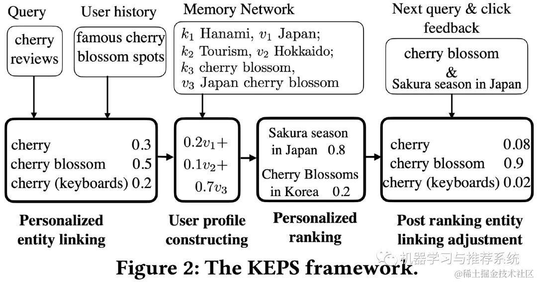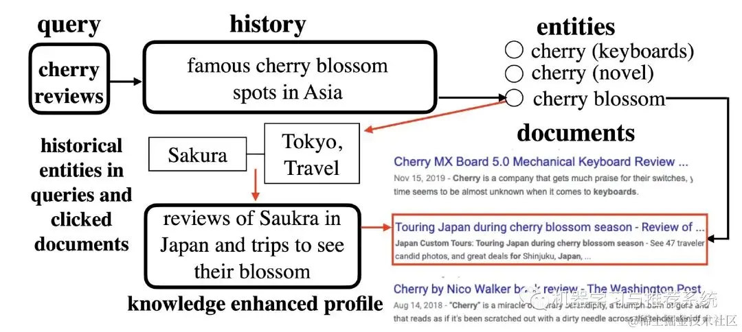 上面这幅图展示了用户输入 “cherry review” 时的一个流程,从用户的历史行为可以看到这里 cherry 这个实体指的是樱桃花。接着通过实体链接图谱,找到樱花和 Tokyo,Sakura 之间的联系,进而就可以得到一些相关的文档了。