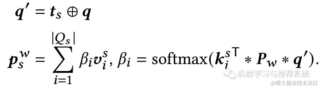 不同的 key 和 value 其实是提供了不同的特征表达方式,而考虑到直接用 query 的 embedding 不能充分的表示当次搜索的意图,作者还添加了 t_s 短期兴趣作为 query 的补充。所以计算方法就成了如下这样: