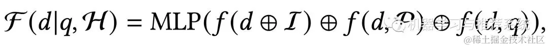 相当于分别计算文档和用户意图的相关性,候选文档和用户偏好的相关性,以及候选文档与输入的 query 之间的相关性。三部分的 embedding 向量进行拼接,经过一个 MLP 层就是最终的排序得分。