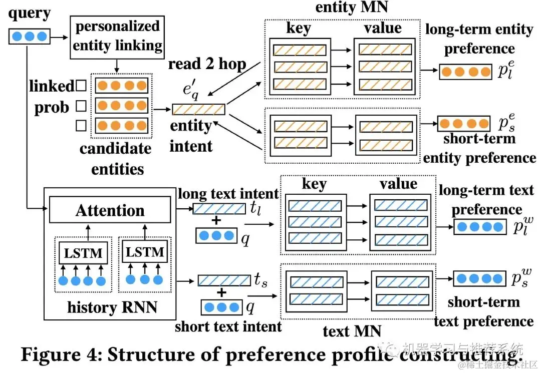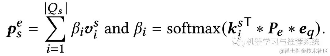 这里将用户历史行为中的 query **「实体」**向量作为 key,然后点击过的文本向量作为 value,然后利用下面的公式来计算用户短期历史的实体偏好,长期历史只需要将公式中所有的 s 换成 l ,同样的计算思路。