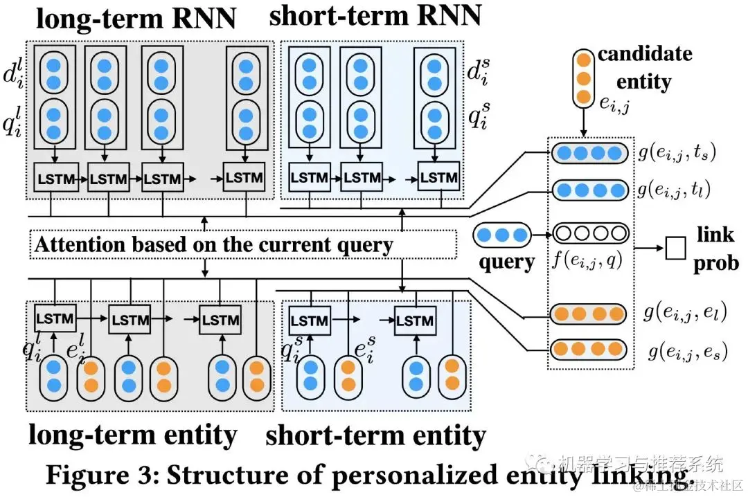 上面的式子是一个计算过程,在给定 query 和历史行为 H 的情况下,实体 i 是 意图 j 的概率为 p_ij。所谓的个性化的实体链接,其实就是针对不同的用户历史,这里的 p_ij 都会是不同的取值,那么问题就转变到了如何构建出来个性化的 p_ij,具体的内容通过下面这幅图进行介绍: