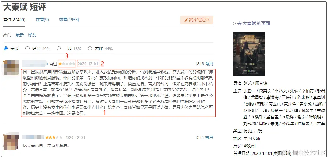 虽然我还没有看过这个新剧,但是对于小伙伴们讨论的内容,却颇有兴趣(主要还是大家老是讨论这个剧)。因此,我用Python爬取了《大秦赋》的相关数据,进行了一波分析。