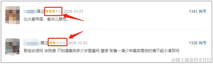 观察原页面的评论星级,可以看到所有的星级并不是以数字展示的,而是用星星进行前端渲染出来的,但是页面的源代码,却展示的是星级数。