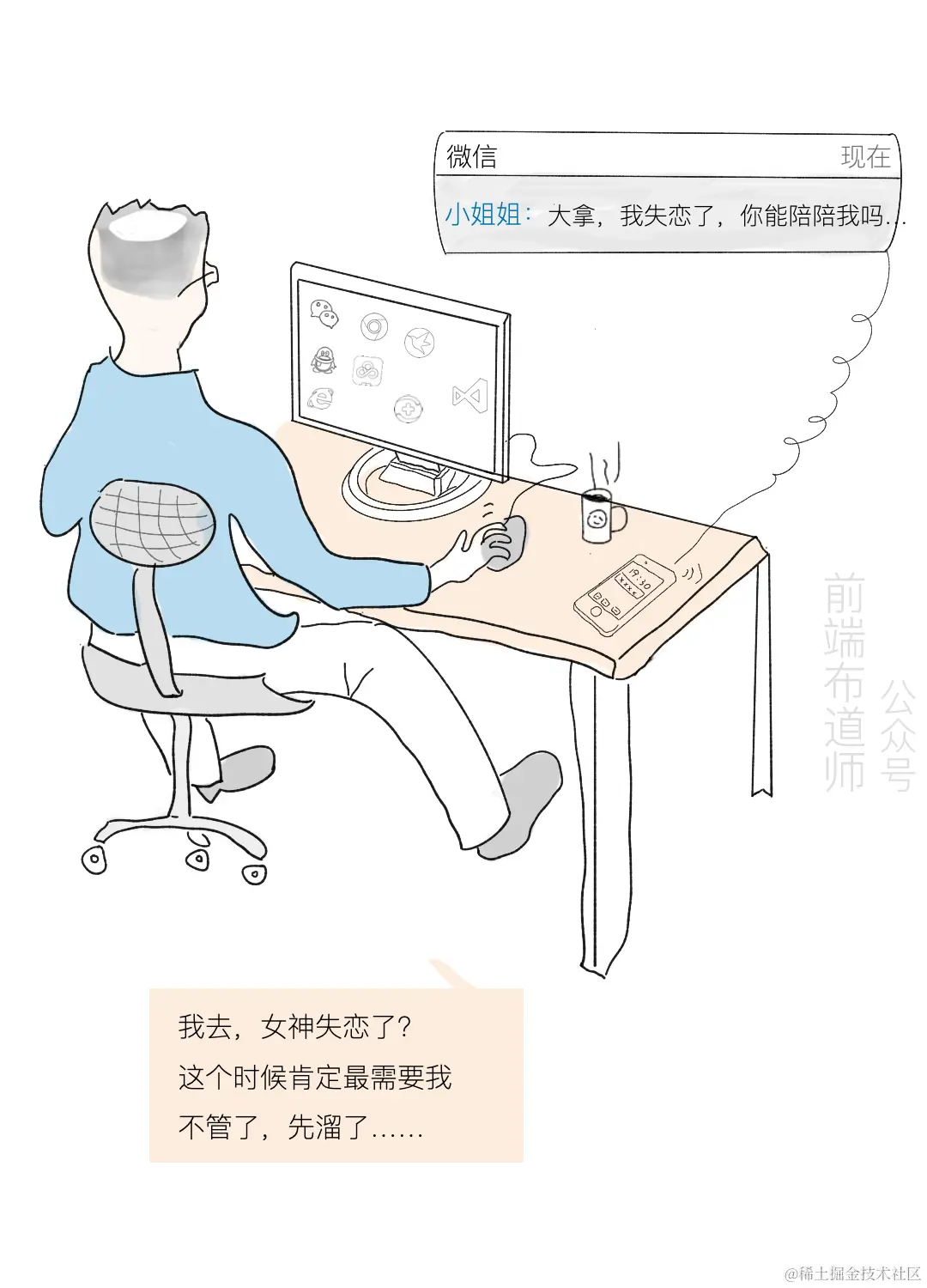 今天这篇漫画,讲述的是一个程序员(王大拿) 看到女神发来失恋的信息,匆忙下班赶着去撩妹,忘记了关电脑,而引发的一系列故事...