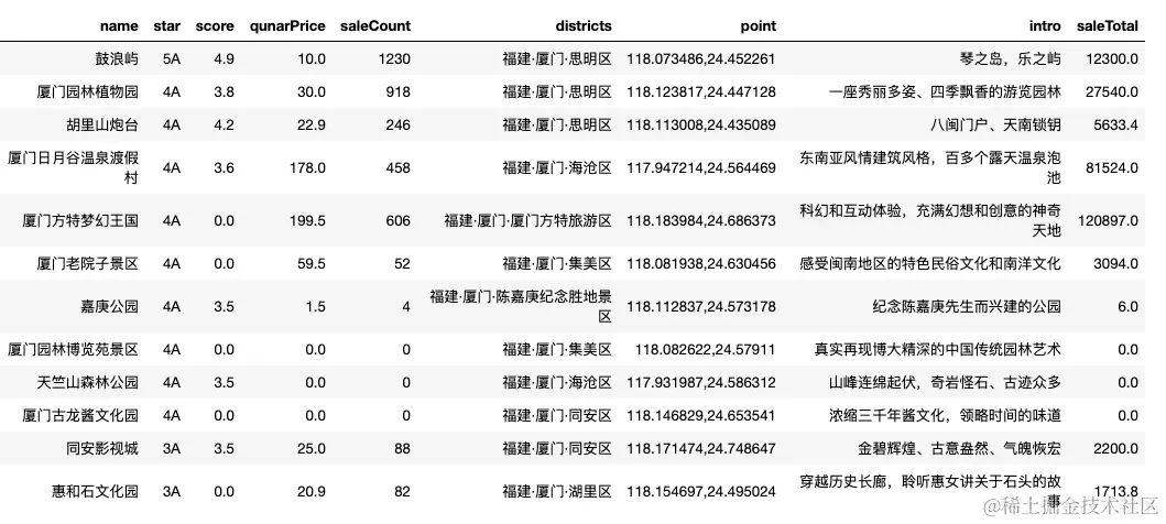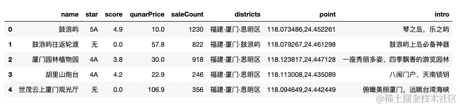 df = pd.read_csv("/菜J学Python/旅游/厦门旅游景点.csv",names=['name', 'star', 'score','qunarPrice','saleCount','districts','point','intro'])