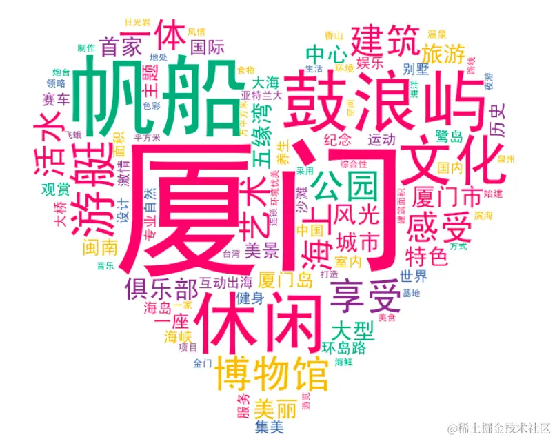 通过对厦门景点介绍文本进行词云图绘制,我们很容易看出厦门的特点。典型的海滨休闲城市,帆船、鼓浪屿、游艇等词被大量提及,建筑、博物馆等词也有一定提及,体现出厦门浓厚的人文气息。