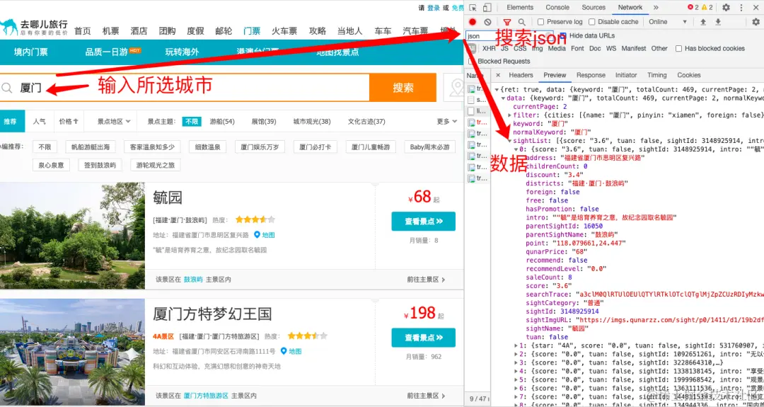 去哪儿网数据采集相对简单,找到真实url后,构造参数拼接,用request请求到json数据,以追加模式将数据存储为csv文件即可。
