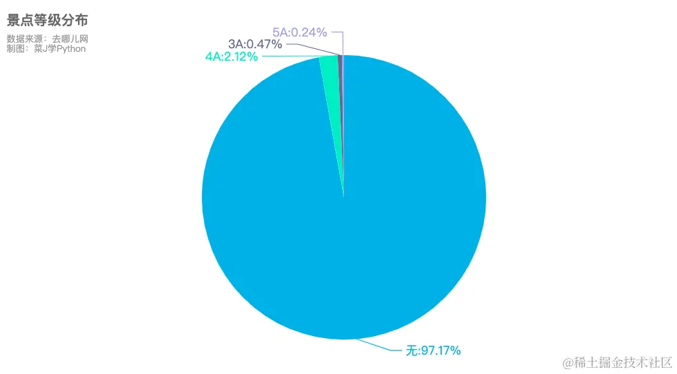 .set_global_opts(legend_opts = opts.LegendOpts(is_show = False),title_opts=opts.TitleOpts(title="景点等级分布",subtitle="数据来源:去哪儿网\n制图:菜J学Python",pos_top="0.5%",pos_left = 'left'))