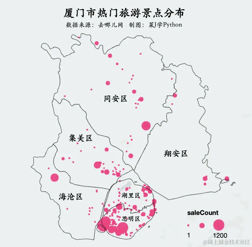 利用kepler.gl绘制厦门市旅游景点分布地图,同时以圆圈的大小表示门票月销量的大小,我们可以很清晰的看到,厦门市景点集中分布在思明区和湖里区,其他区域分布较为分散。尤其是思明区,门票销量遥遥领先其他区域。
