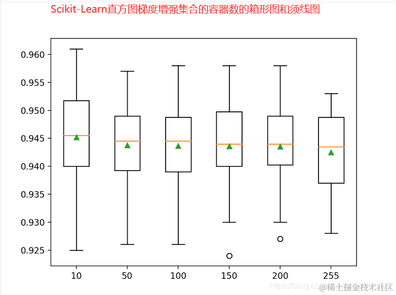 运行示例将评估综合数据集上的模型性能,并报告均值和标准差分类准确性。注意:由于算法或评估程序的随机性,或者数值精度不同,您的结果可能会有所不同。考虑运行该示例几次并比较平均结果。在这种情况下,我们可以看到scikit-learn直方图梯度提升算法在合成数据集上实现了约94.3%的平均准确度。
