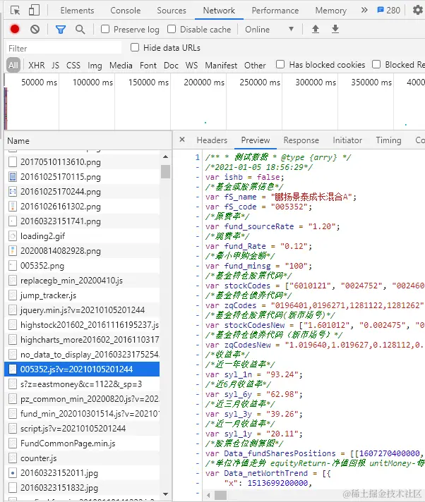 →打开chrome的开发者调试,选择Network,然后刷新一下,很快我们就能发现这是基金代码加当前时间的一个接口请求的url: