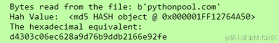在此代码中,我们首先创建了一个示例文本文件。然后,我们以字节为单位读取该文件的内容。我们将字节转换为哈希值,然后最终看到相同的十六进制等效项。