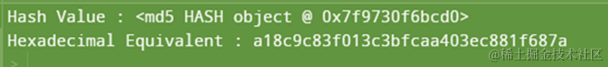 在此代码中,我们采用字节输入,这是哈希函数可接受的。然后,我们使用md5哈希函数对该值进行编码。最后,我们使用digest()函数生成了编码字符串的等效字节。