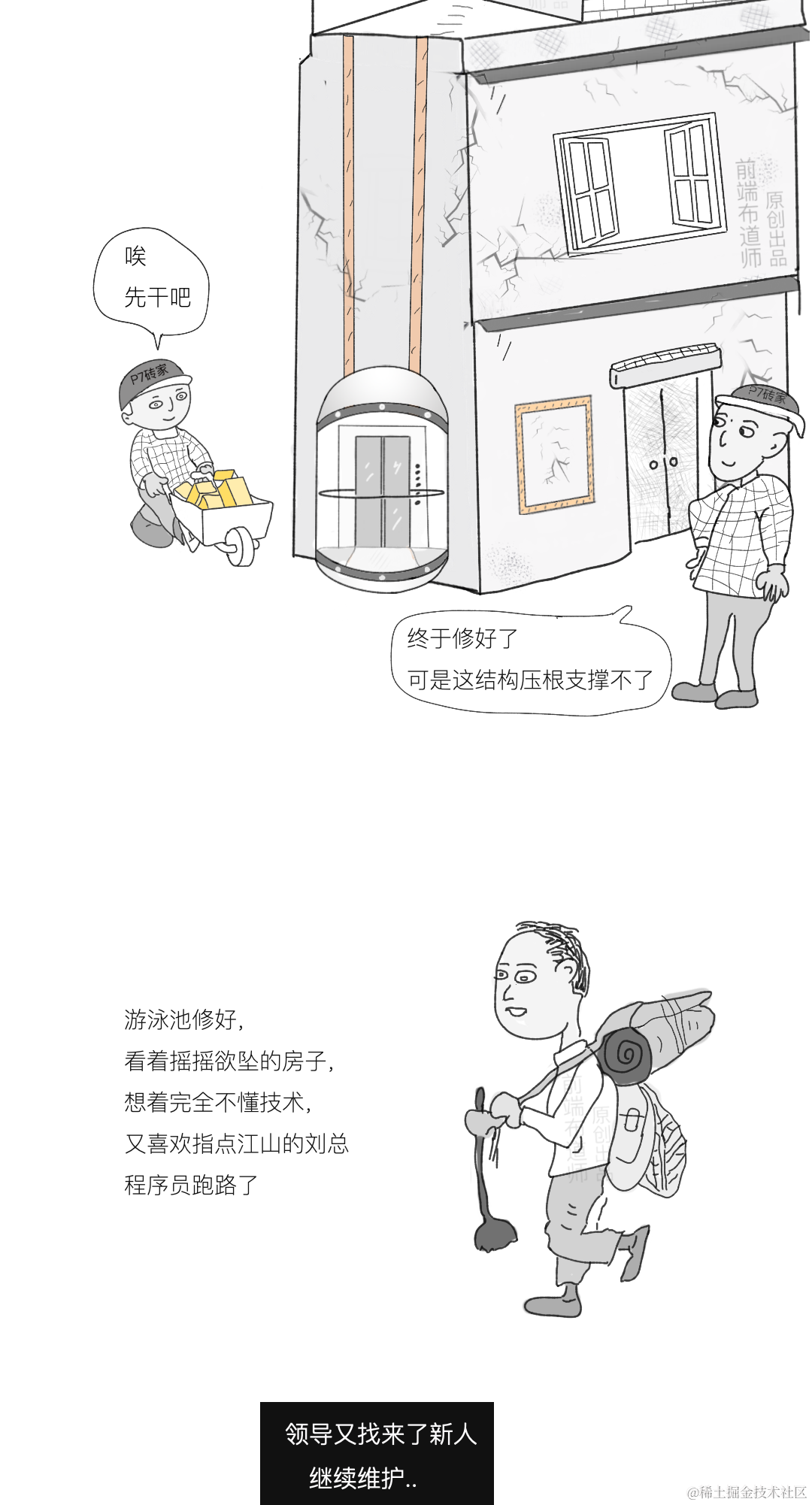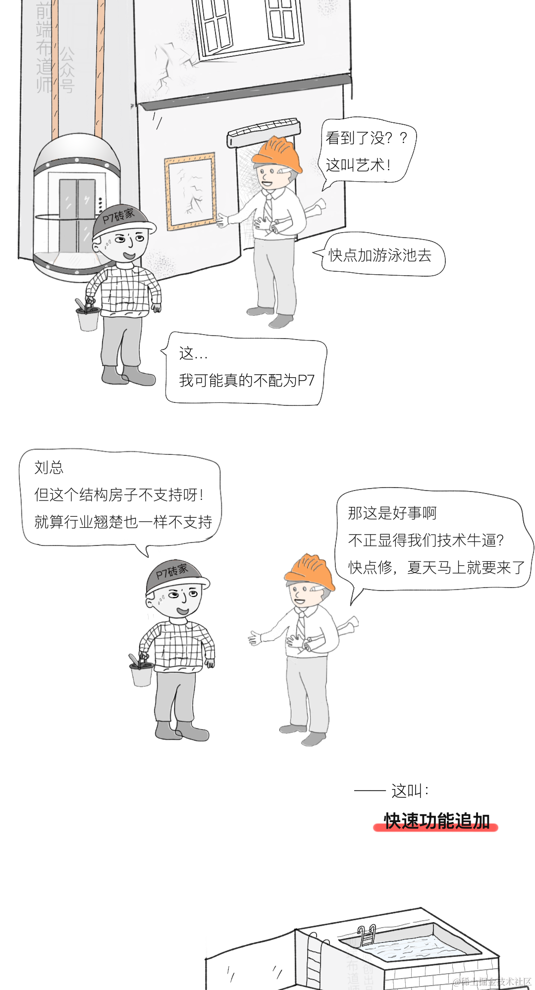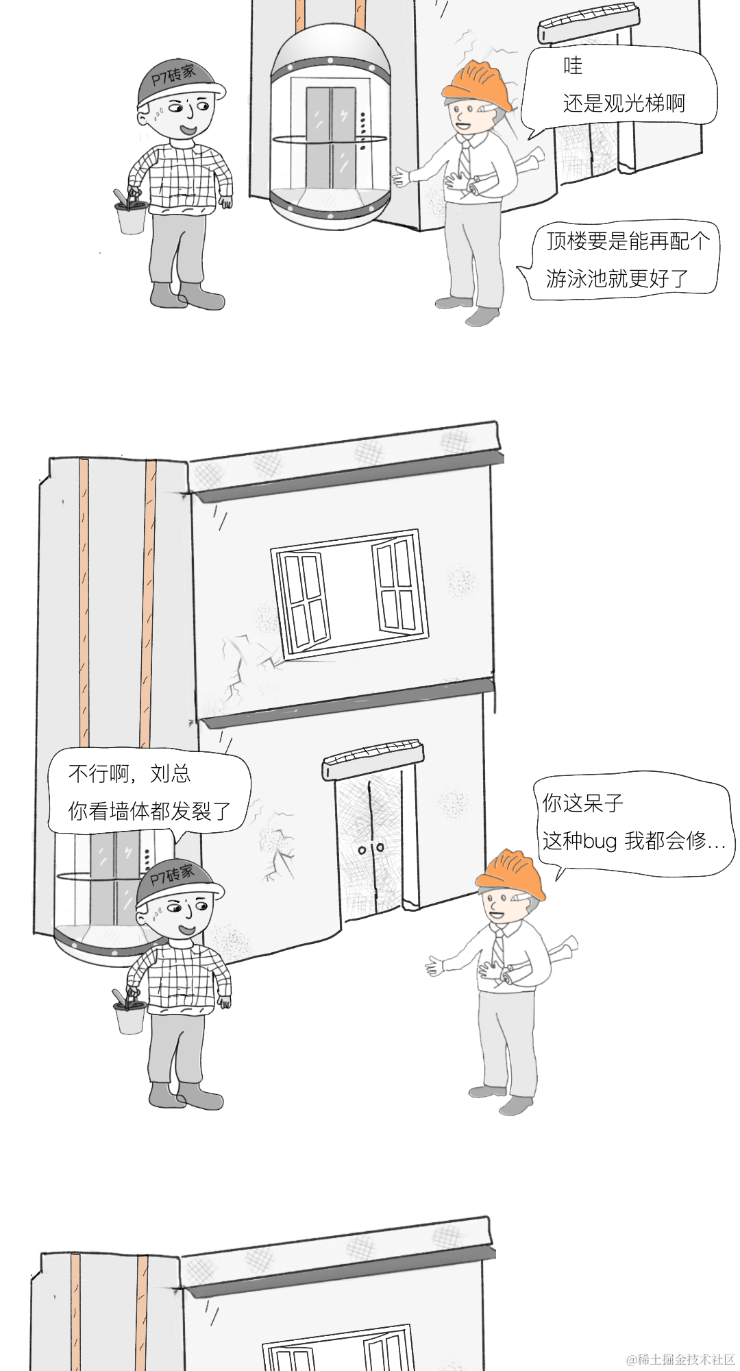 而bug的产生,大多源于遇上不懂技术的领导或老板,到处跟业务部门、客户等吹牛逼,保证项目开发能有多快、多好、多稳,但当真正需求出来后,经过开发人员评估,时间远远超出他吹牛皮的范围,然后就开启了压迫模式,逼程序员加班加点,缩短项目周期来补全他的面子,导致项目基础构架不到位,测试用例范围不够广,就像漫画中的情节一样,地基不牢,摇摇晃晃勉强上线了,后期无法维护,改一个地方有十个地方会受到影响,用户的行为超出测试用例范围外,系统立刻崩溃~,然后老板知道后,颜面尽失,反过来又指责程序员.