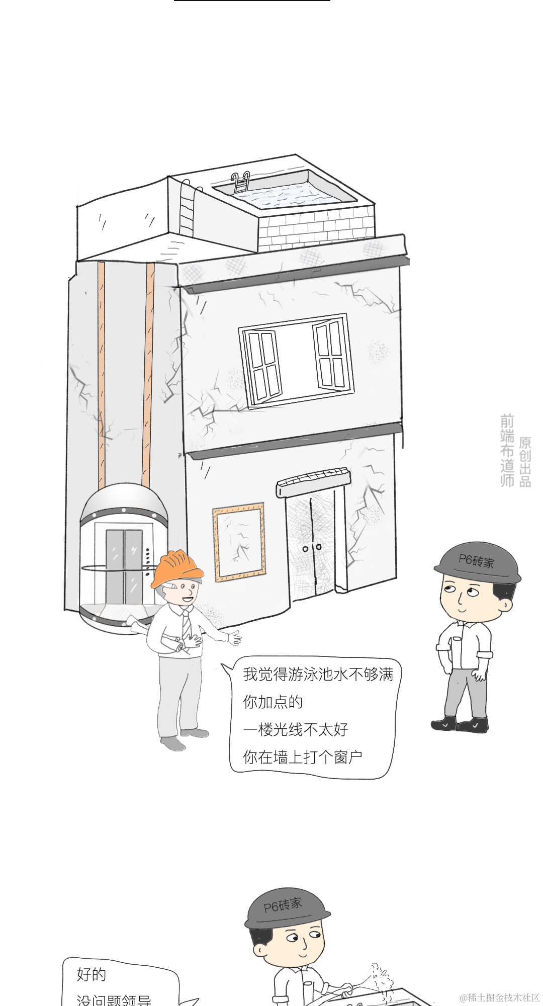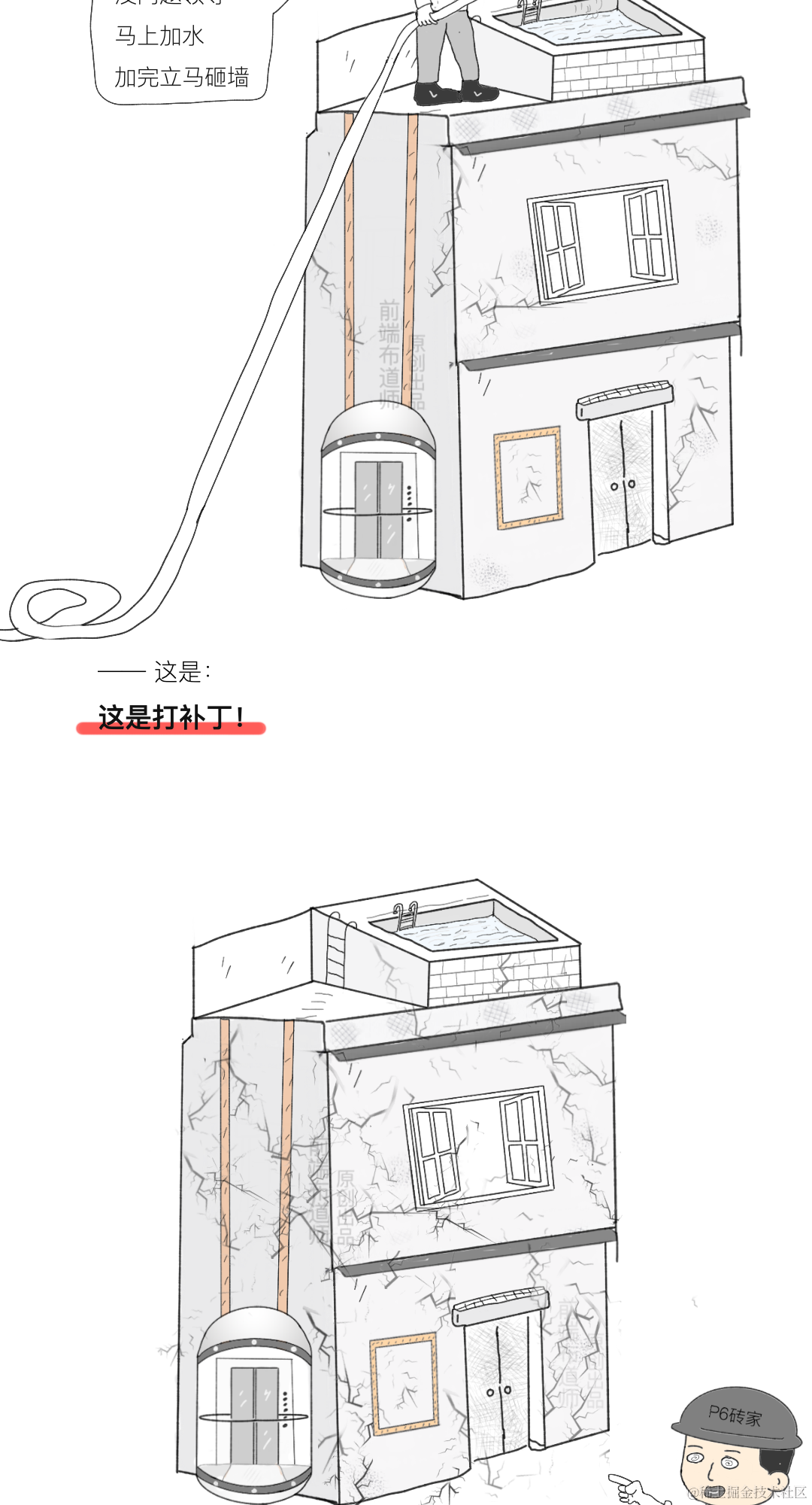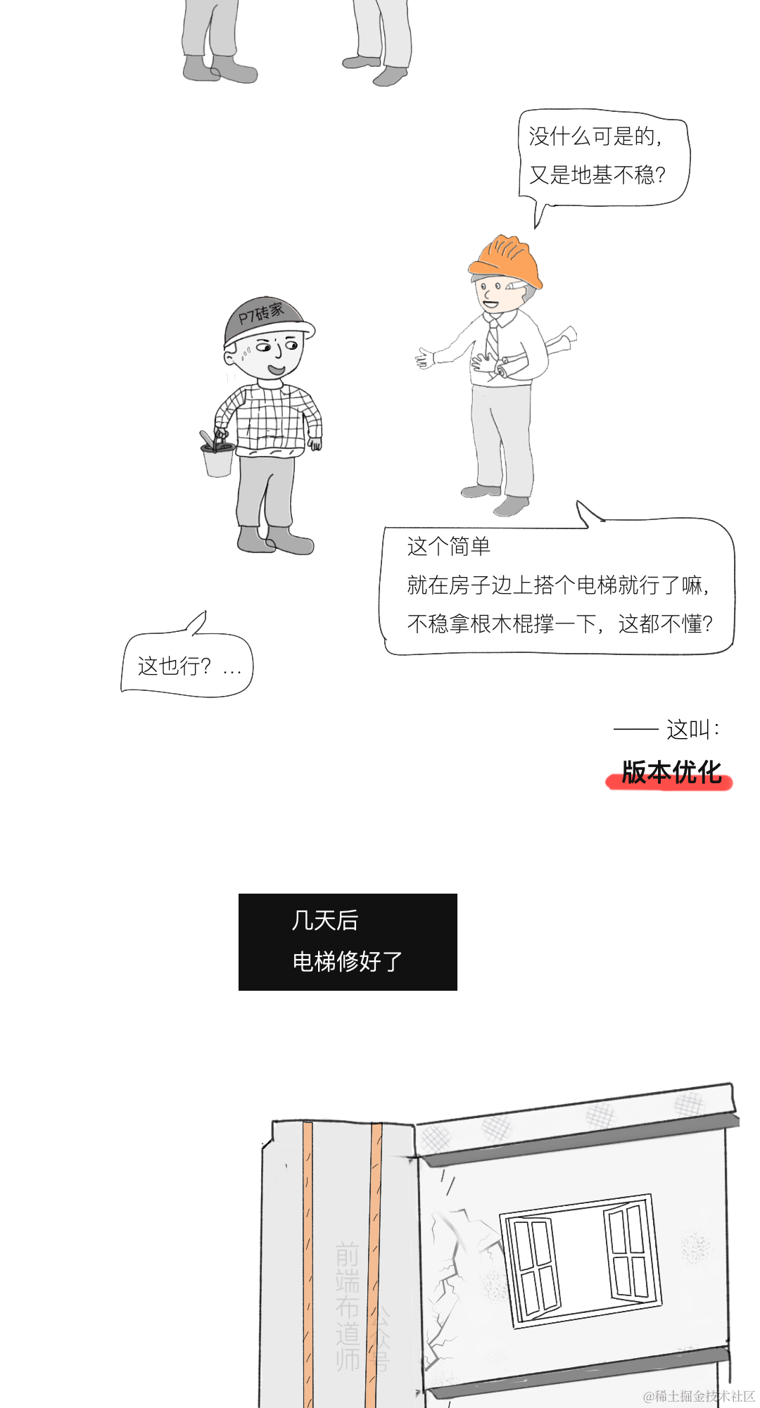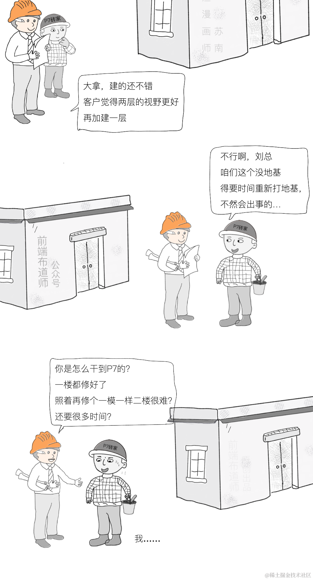 而bug的产生,大多源于遇上不懂技术的领导或老板,到处跟业务部门、客户等吹牛逼,保证项目开发能有多快、多好、多稳,但当真正需求出来后,经过开发人员评估,时间远远超出他吹牛皮的范围,然后就开启了压迫模式,逼程序员加班加点,缩短项目周期来补全他的面子,导致项目基础构架不到位,测试用例范围不够广,就像漫画中的情节一样,地基不牢,摇摇晃晃勉强上线了,后期无法维护,改一个地方有十个地方会受到影响,用户的行为超出测试用例范围外,系统立刻崩溃~,然后老板知道后,颜面尽失,反过来又指责程序员.