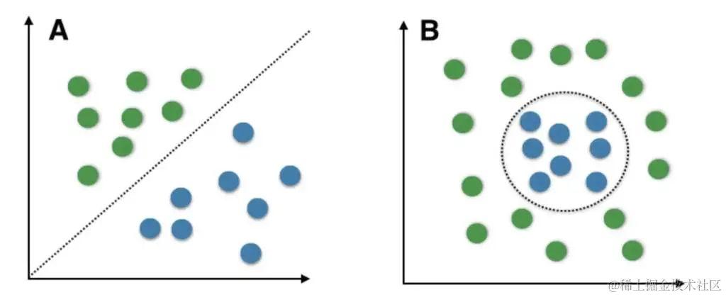 下面图像A是一个线性可分问题,也就是说对于两类点(蓝点和绿点),你通过一条直线就可以实现完全分类。