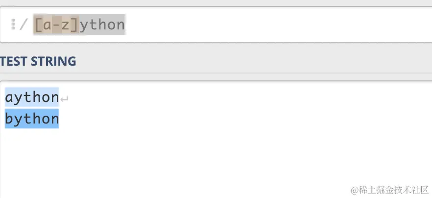 使用 ^ 可以匹配补集,例如[^p]ython,就能匹配除了p之外的字符。