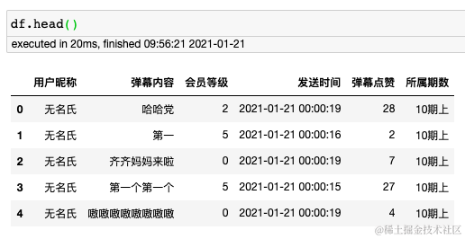 df = df[["用户昵称","弹幕内容","会员等级","发送时间","弹幕点赞","所属期数"]]