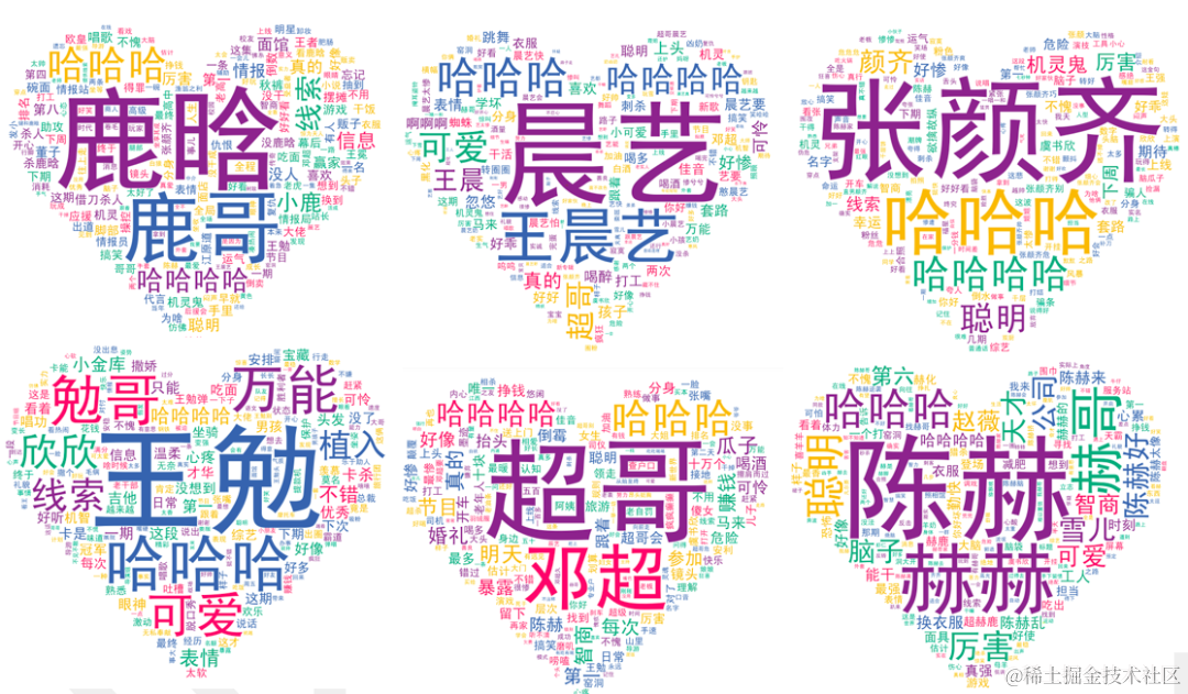 我们分别对六位主要提及演员进行词云图绘制,发现他们的人缘是真的好,几乎看不到负面的评价。陈赫的外号还挺多:赫赫、赫哥,不做词云我还不知道呢,看来要补充知识点了。