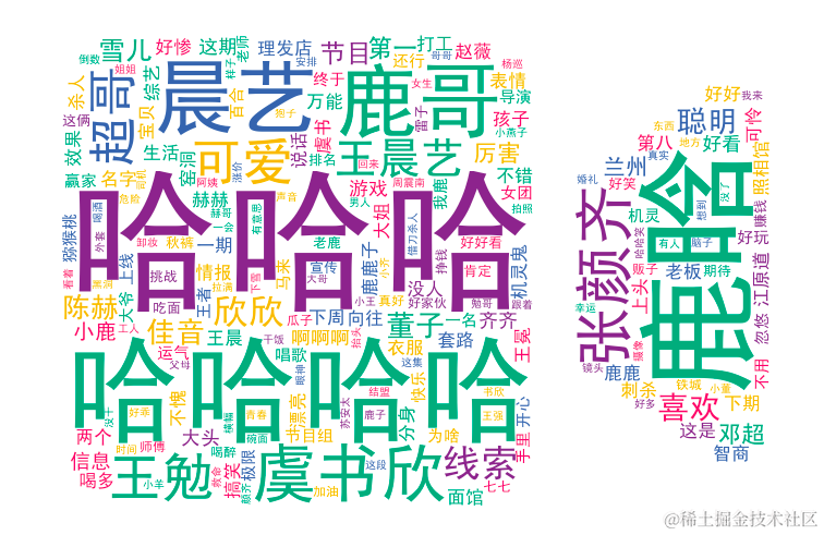 通过对4万+弹幕制作词云图,我们发现,弹幕中出现频率较高的词汇有「哈哈哈、鹿晗、晨艺、虞书欣」等。这综艺的初衷,是让观众在看节目的过程中频繁大笑,由弹幕可知,效果还是很明显的。鹿晗在这一期表现亮眼,躺赢刺杀游戏,被很多观众夸赞。