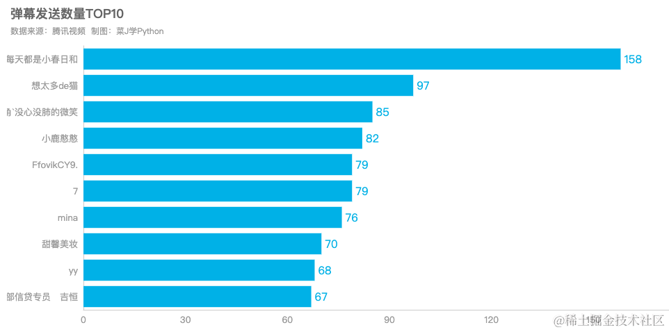 .set_global_opts(title_opts=opts.TitleOpts(title="弹幕发送数量TOP10",subtitle="数据来源:腾讯视频 \t制图:菜J学Python",pos_left = 'left'),