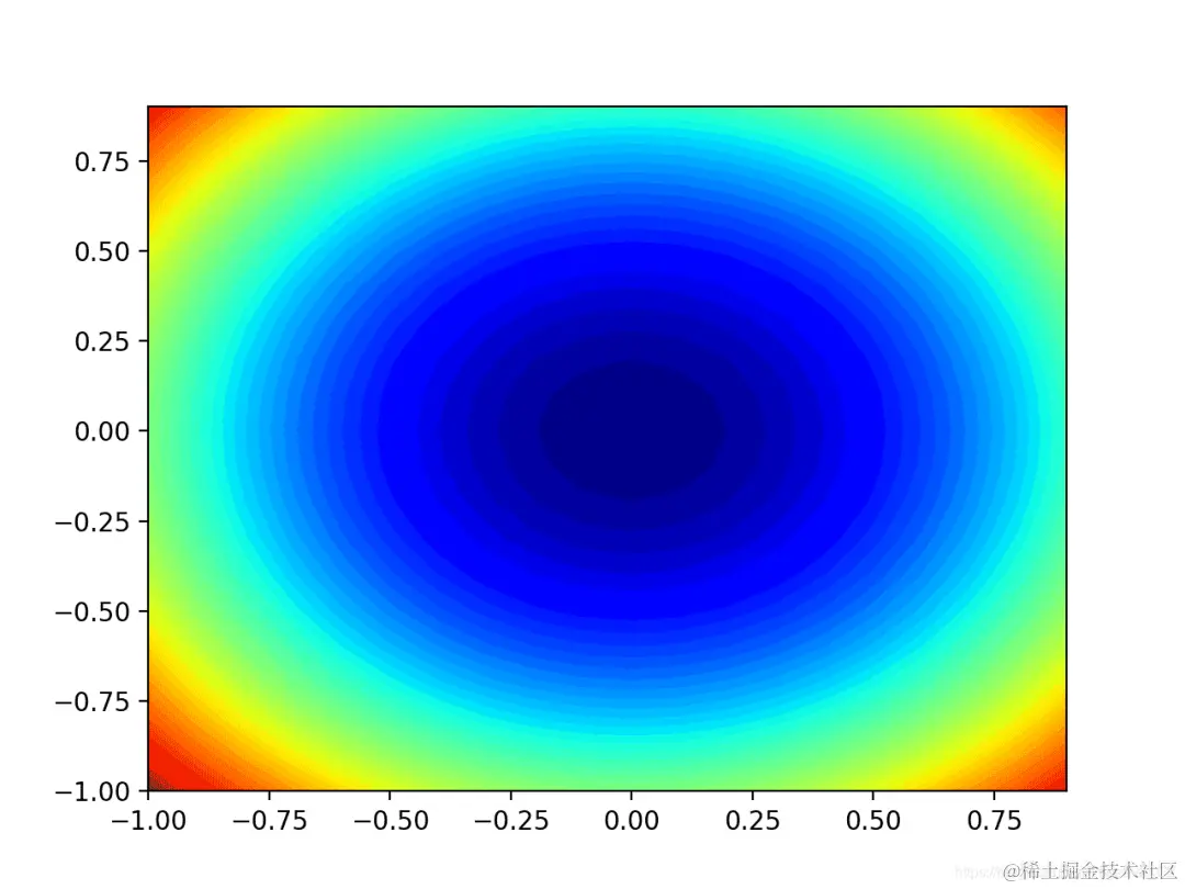 运行示例将创建目标函数的二维轮廓图。我们可以看到碗的形状被压缩为以颜色渐变显示的轮廓。我们将使用该图来绘制在搜索过程中探索的特定点。