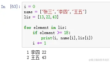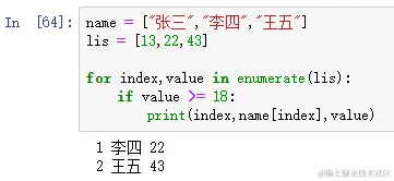 普通for循环我也就不多说了。仔细观察for循环+enumerate()函数的搭配使用,序列使用过该函数后,会返回元素下标和元素组合的元组,我们采用序列解包的方式,将其赋值给了index和value,其中index表示lis列表中每个元素的下标,value表示lis列表中每个元素的值,如下图所示: