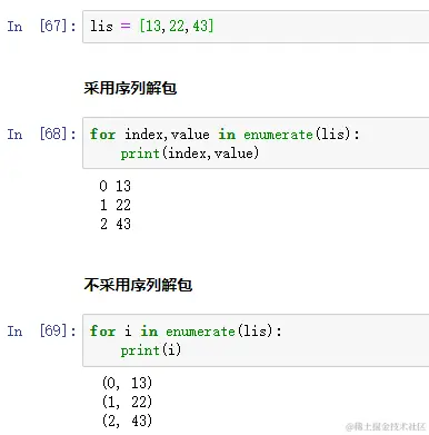 - ③ enumerate()函数得到的是多个值,我们需要采用“序列解包”的方式,获取到每一个元素;