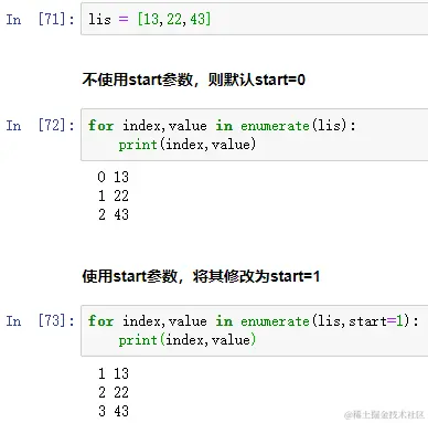 - ② 默认情况下,start参数索引计数器是从零开始计数的,但是你可以将其设置为任意的整数;