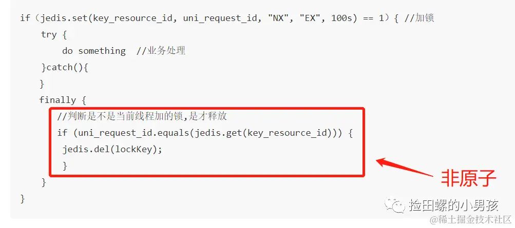 if(jedis.set(key_resource_id, lock_value, "NX", "EX", 100s) == 1){ //加锁