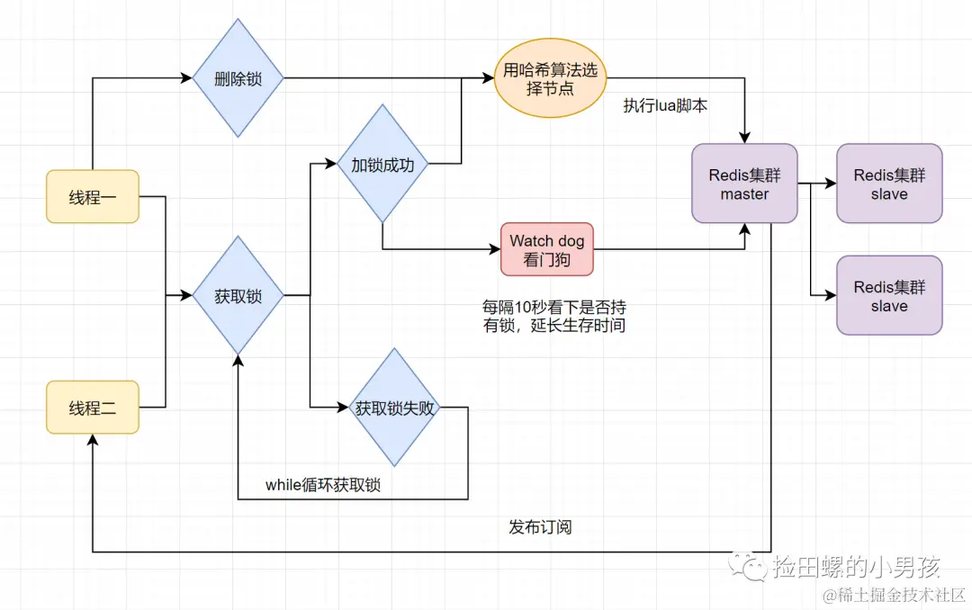 Redisson 使用了一个Watch dog解决了锁过期释放,业务没执行完问题,Redisson原理图如下: