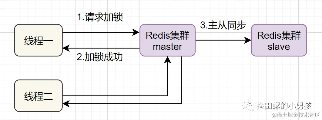 如果线程一在Redis的master节点上拿到了锁,但是加锁的key还没同步到slave节点。恰好这时,master节点发生故障,一个slave节点就会升级为master节点。线程二就可以获取同个key的锁啦,但线程一也已经拿到锁了,锁的安全性就没了。