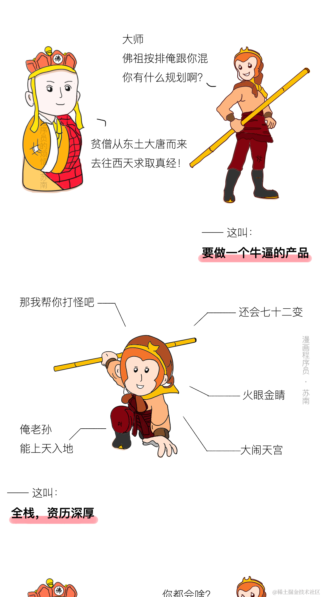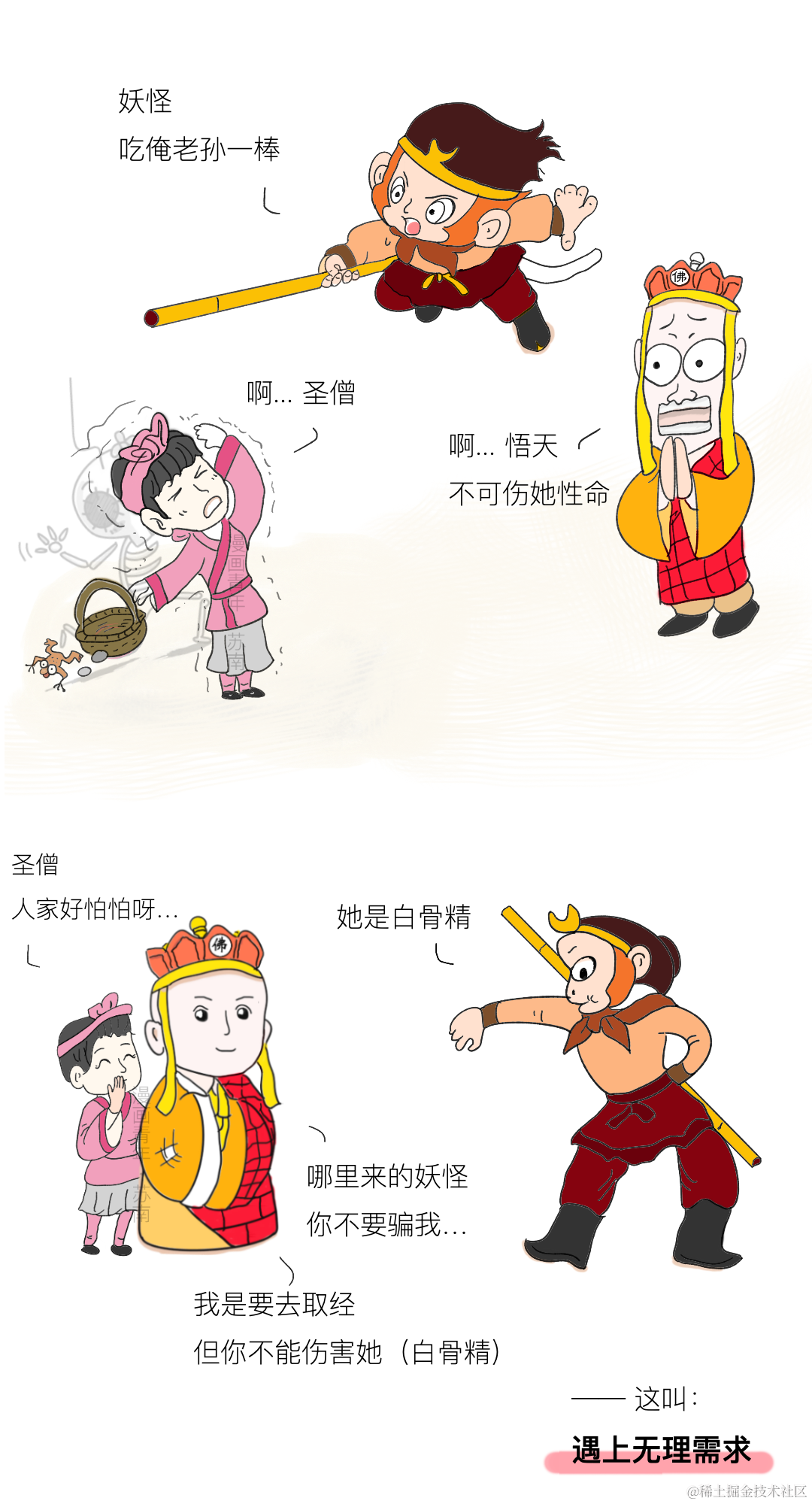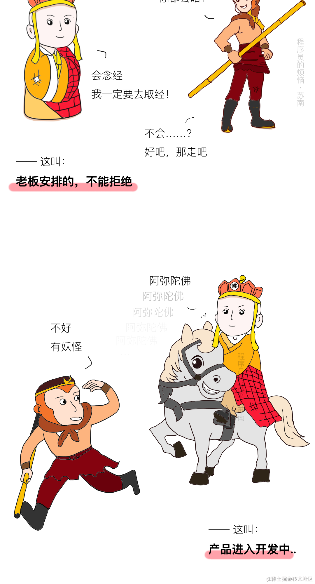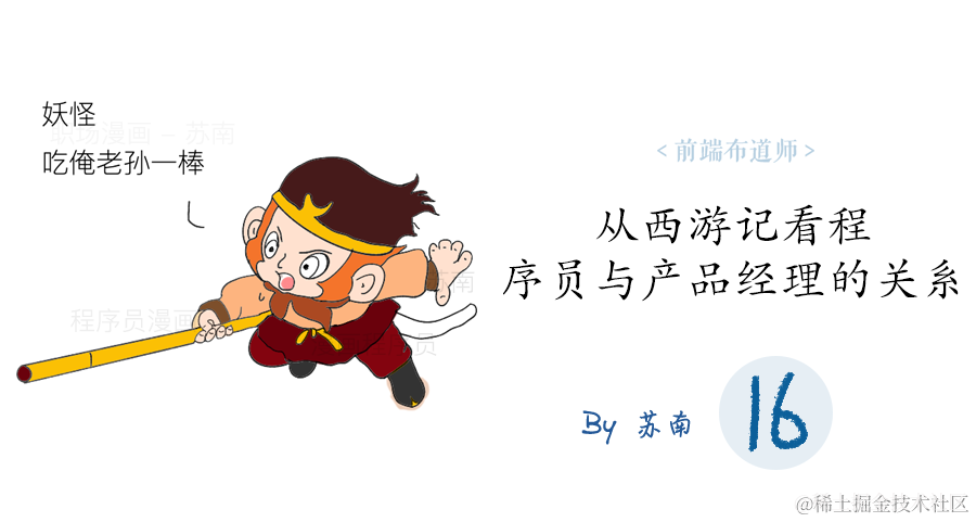 说到程序员,永远少不了产品经理的事,最近在B站、知乎上都看到一个视频/话题,是来自云栖吐槽大会的,讲的是程序员与产品经理的关系——是唐僧和孙悟空的关系,我觉得非常形象,于是尝试用图文的形式演绎了一下.