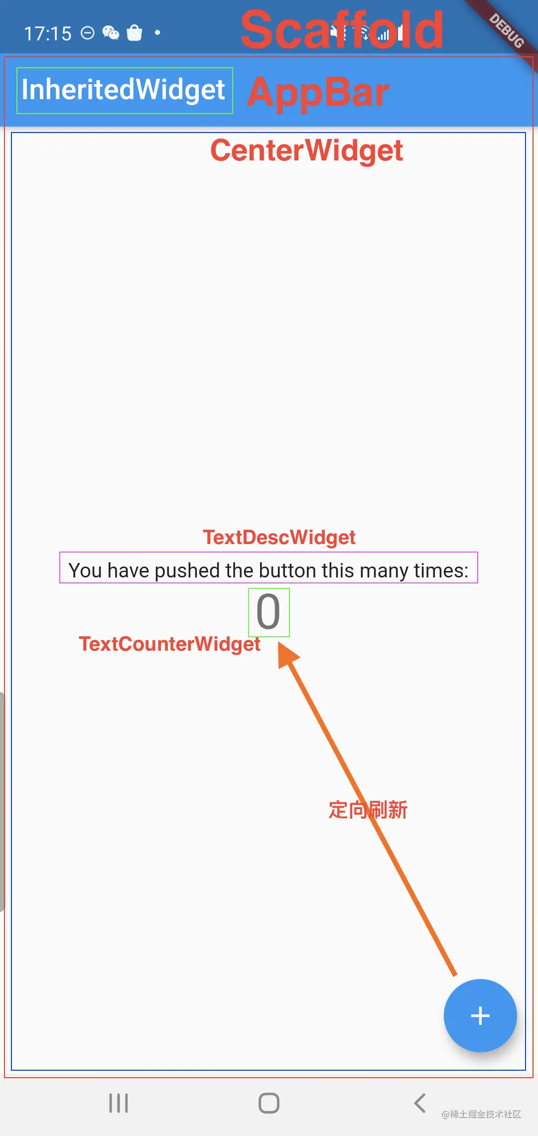 我们把原来的一个文件,拆成几个组件,然后组合起来。如果不使用InheritedWidget,counter值就需要从Scaffold--->CenterWidget--->TextCounterWidget层层传递。现在只需要通过of方法就可以实现数据的向下传递。