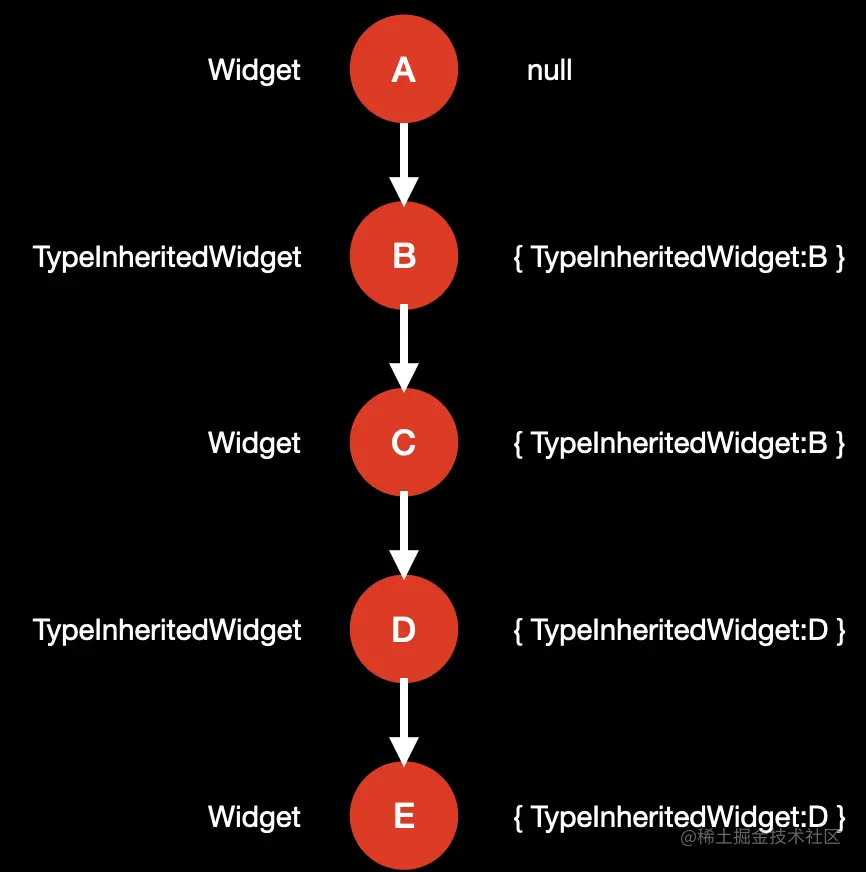 B节点是TypeInheritedWidget的Element,所以它的map是{ TypeInheritedWidget:B对象 }