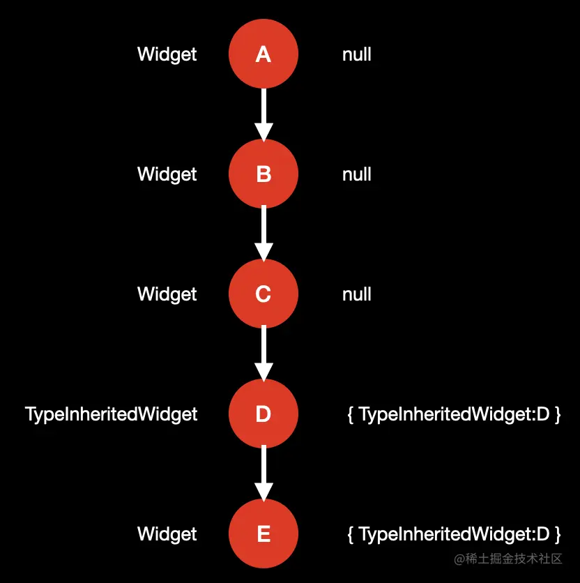 E节点向上查找的TypeInheritedWidget的Element时候,就拿到了D对象,而不是B对象,这就是 最近原则。