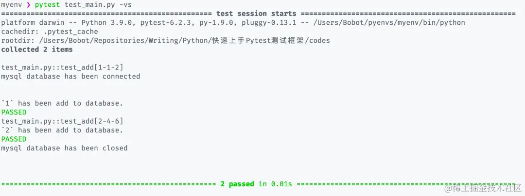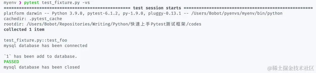 在注入的过程中 pytest 会帮我们执行 myclient() 中 db 对象的 connect() 方法调用模拟数据库连接的方法,在测试完成之后会再次帮我们调用 close() 方法释放资源。