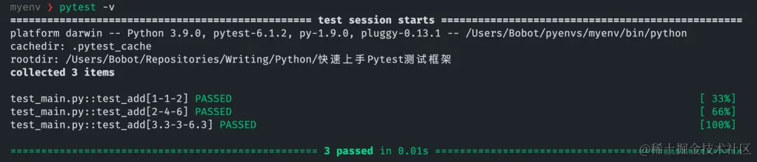 通过 pip install pytest 安装 pytest 之后,我们就可以快速实现我们的第一个测试。