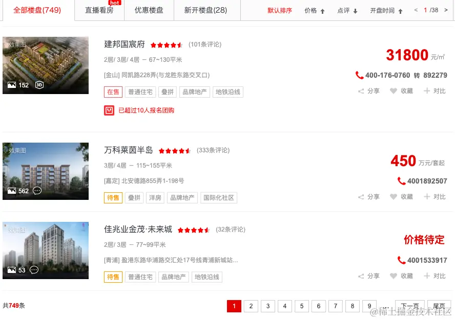 这是上海新盘列表,合计749个房源信息(每页20个),点击下一页,URL变为:
