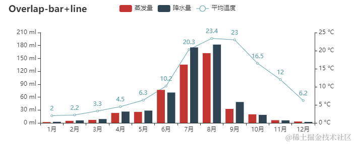 from pyecharts import options as opts from pyecharts.charts import Bar, Line from pyecharts.faker import Faker v1 = [2.0, 4.9, 7.0, 23.2, 25.6, 76.7, 135.6, 162.2, 32.6, 20.0, 6.4, 3.3] v2 = [2.6, 5.9, 9.0, 26.4, 28.7, 70.7, 175.6, 182.2, 48.7, 18.8, 6.0, 2.3] v3 = [2.0, 2.2, 3.3, 4.5, 6.3, 10.2, 20.3, 23.4, 23.0, 16.5, 12.0, 6.2] bar = ( Bar(init_opts=opts.InitOpts(width="680px", height="300px")) .add_xaxis(Faker.months) .add_yaxis("蒸发量", v1) .add_yaxis("降水量", v2) .extend_axis( yaxis=opts.AxisOpts( axislabel_opts=opts.LabelOpts(formatter="{value} °C"), interval=5 ) ) .set_series_opts(label_opts=opts.LabelOpts(is_show=False)) .set_global_opts( title_opts=opts.TitleOpts(title="Overlap-bar+line"), yaxis_opts=opts.AxisOpts(axislabel_opts=opts.LabelOpts(formatter="{value} ml")), tooltip_opts=opts.TooltipOpts(trigger="axis", axis_pointer_type="cross"), ) ) line = Line().add_xaxis(Faker.months).add_yaxis("平均温度", v3, yaxis_index=1) bar.overlap(line) bar.render_notebook()从实现上,