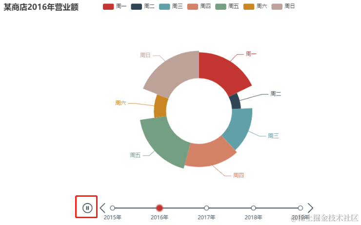 Timeline, 按照展示的时间顺序,将图表add到Timeline上; 可以通过播放按钮循环按照时间顺序展示图表。from pyecharts import options as opts from pyecharts.charts import Pie, Timeline from pyecharts.faker import Faker attr = Faker.choose() tl = Timeline() for i in range(2015, 2020): pie = ( Pie() .add( "商家A", [list(z) for z in zip(attr, Faker.values())], rosetype="radius", radius=["30%", "55%"], ) .set_global_opts(title_opts=opts.TitleOpts("某商店{}年营业额".format(i))) ) tl.add(pie, "{}年".format(i)) tl.render_notebook()