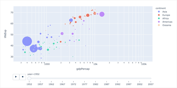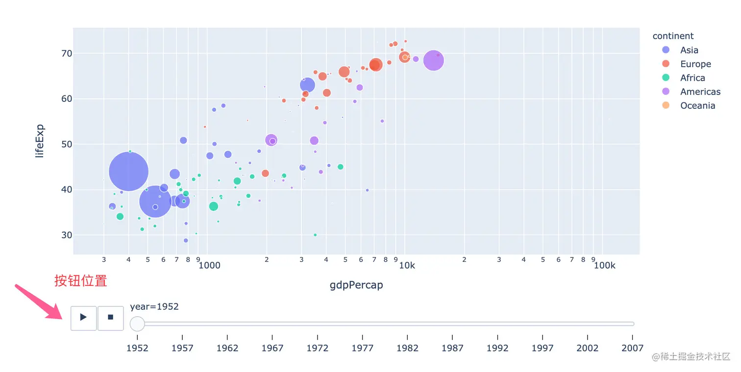 这是Plotly非常厉害的一个功能,能够实现自动播放功能,使用的参数是:animation_frame。我们对整个GDP数据集进行绘图: