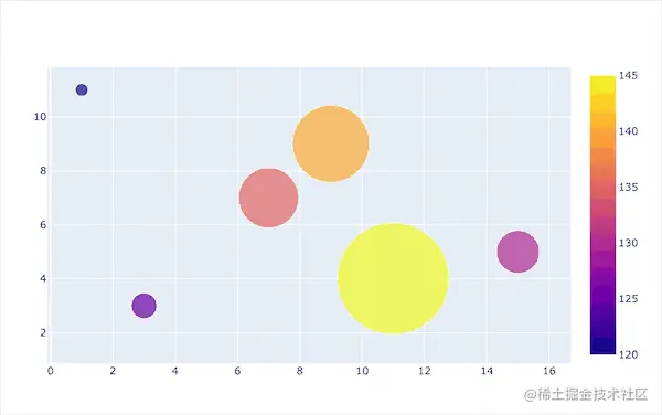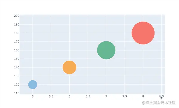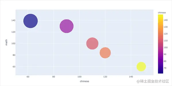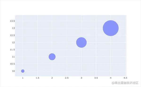 气泡图是也是一种散点图。这种散点图和普通散点图的不同之处在于:它会引入第三方维度,即标记markers的大小来进行展示。在Plotly中散点的大小是通过size参数来设置