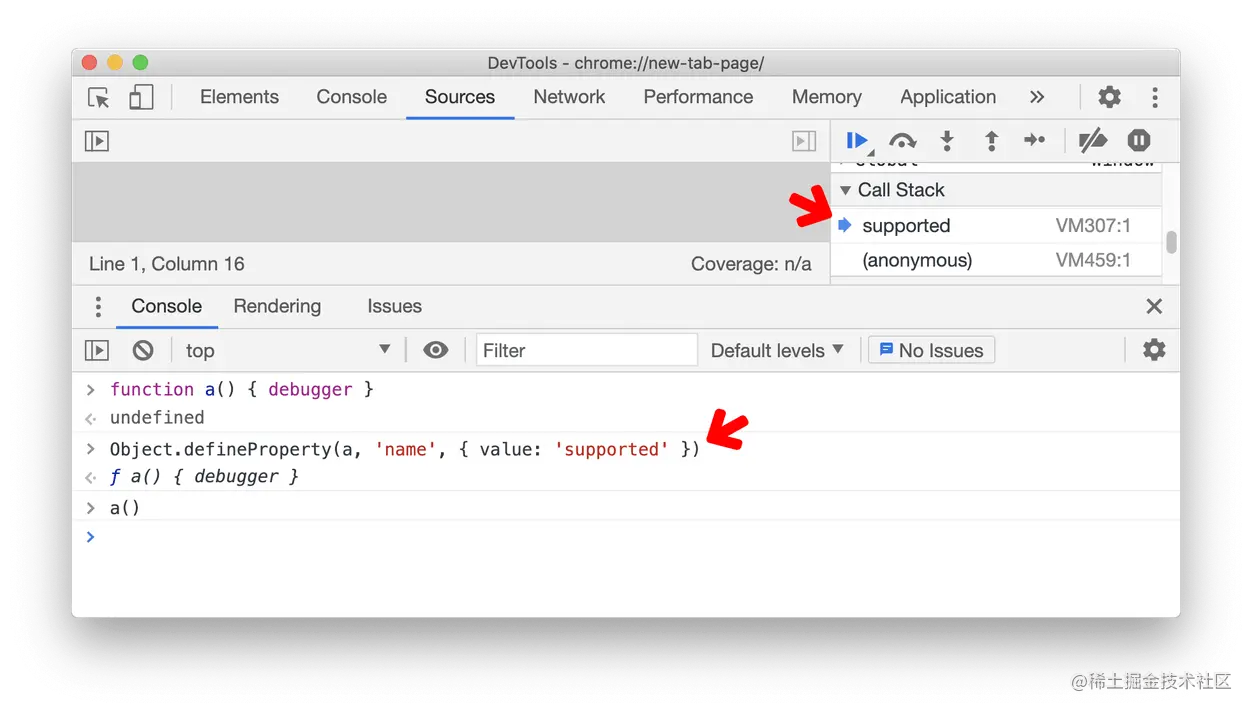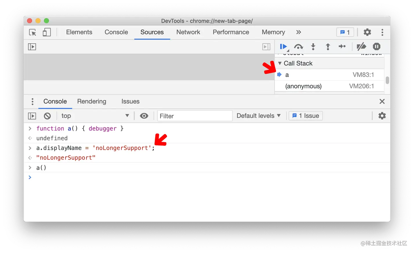 Chrome 一直都支持非标准的 fn.displayName 属性,开发人员可将其做为函数的名称在 error.stack 和 DevTools 的堆栈中展示出来。以前,在上面的示例中,在调用堆栈中 fn.displayName 会显示为 noLongerSupport。