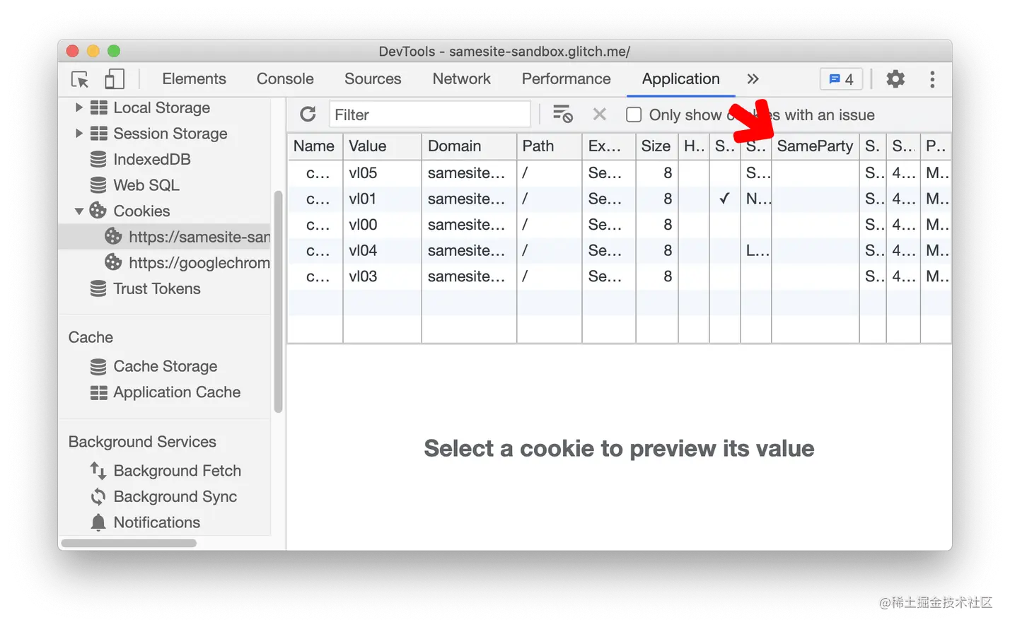 应用程序面板的 Cookies 面板中增加了 SameParty, SameParty 属性是一个布尔值,用于说明同一 First-Party Sets 中的源是否可以在请求中包含 cookie。